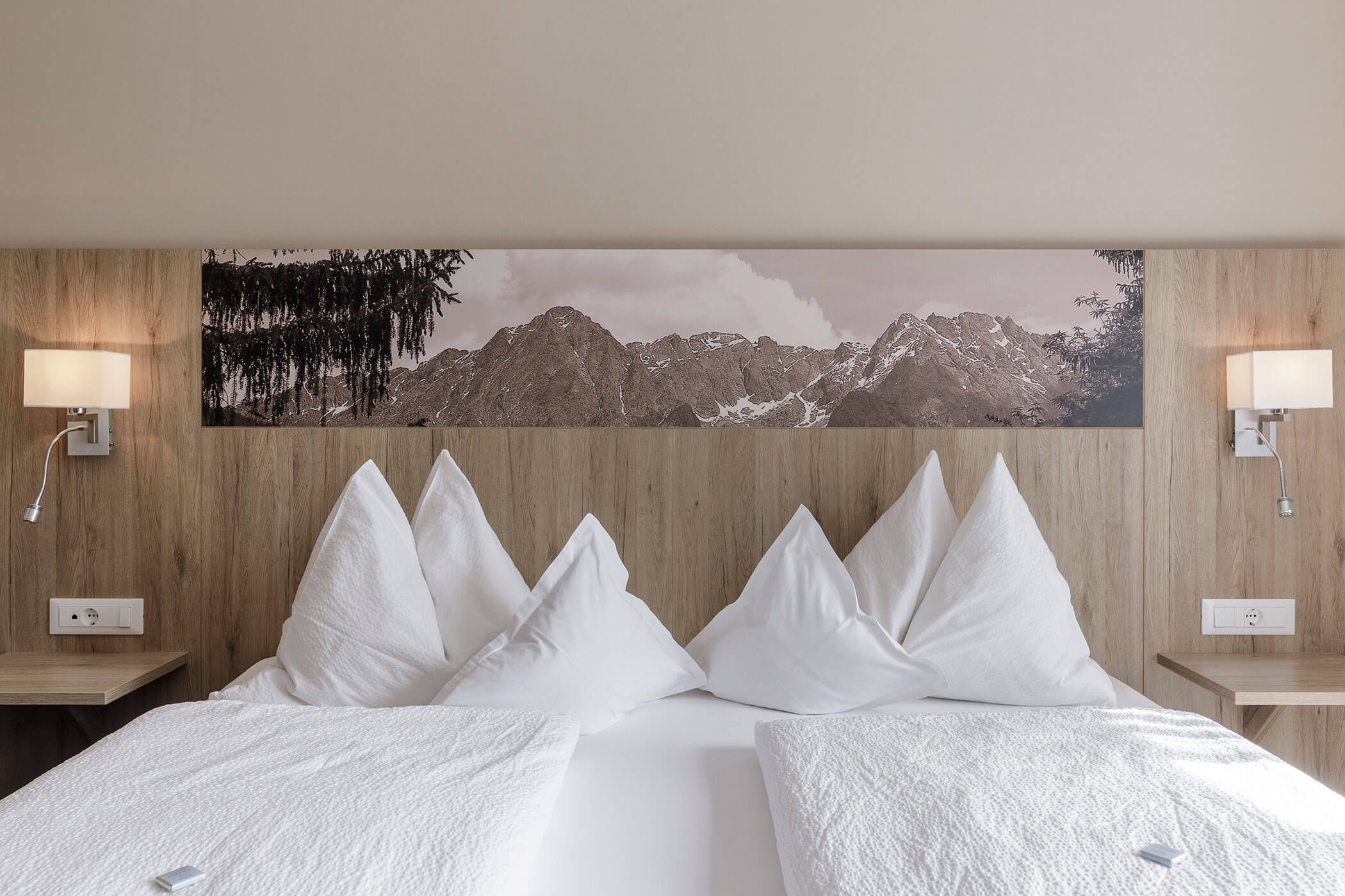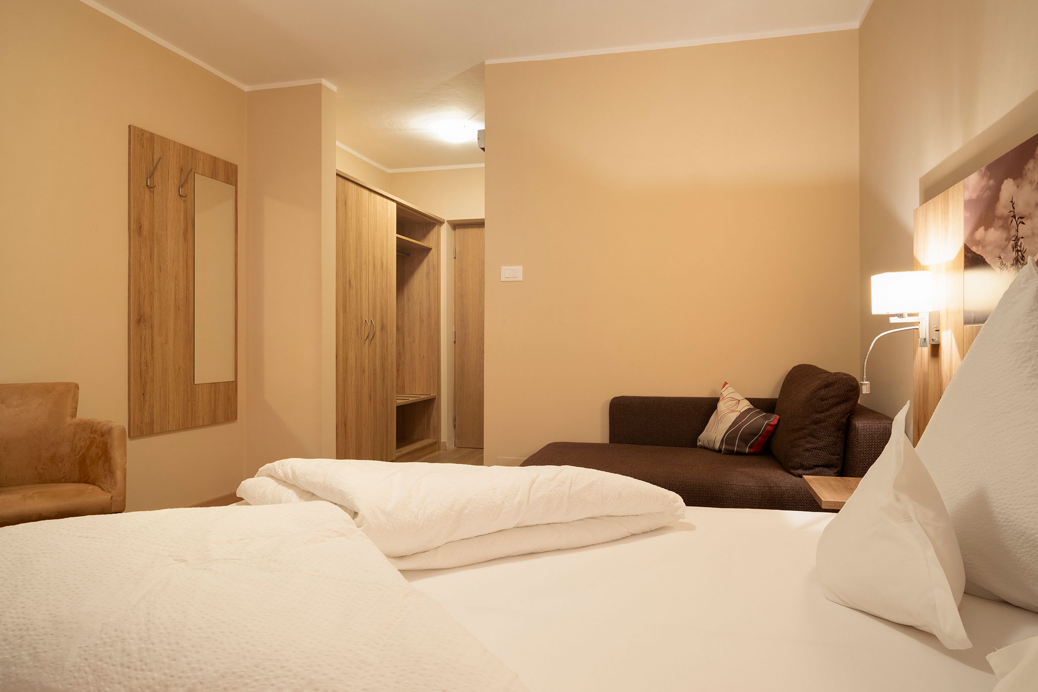 Komfortables Doppelzimmer mit Südwestbalkon und weitem Panoramablick ins Tal. Helles Holz und natürliche Materialien sorgen für eine warme, ruhige Atmosphäre.