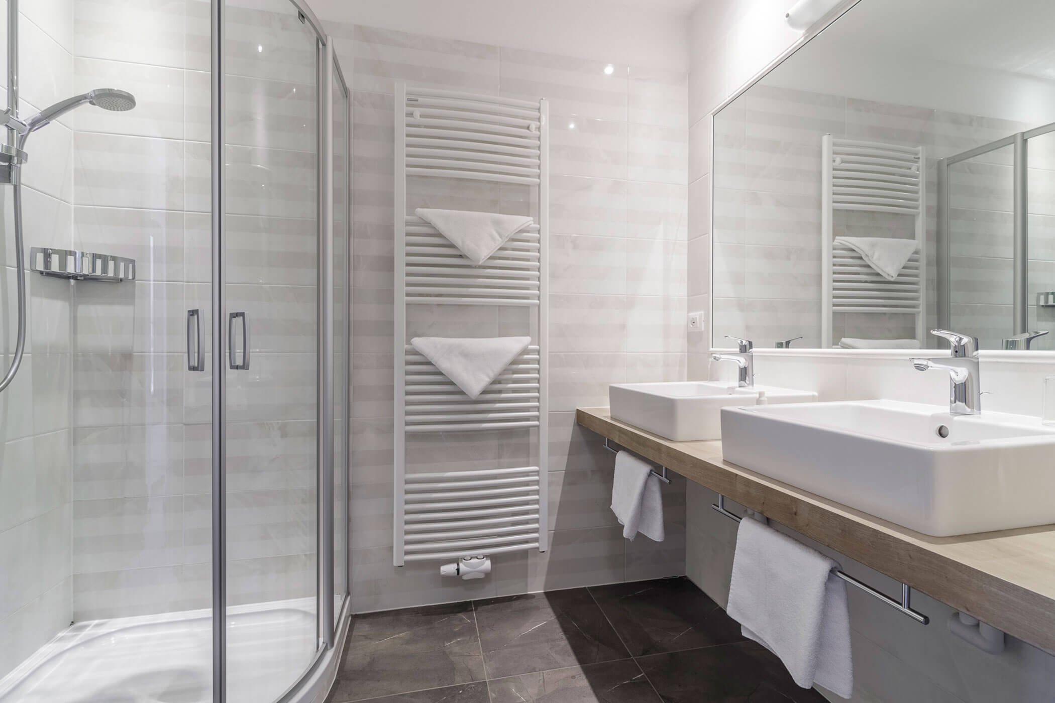 Badezimmer mit Dusche, WC, Haarföhn, Pflegeprodukte