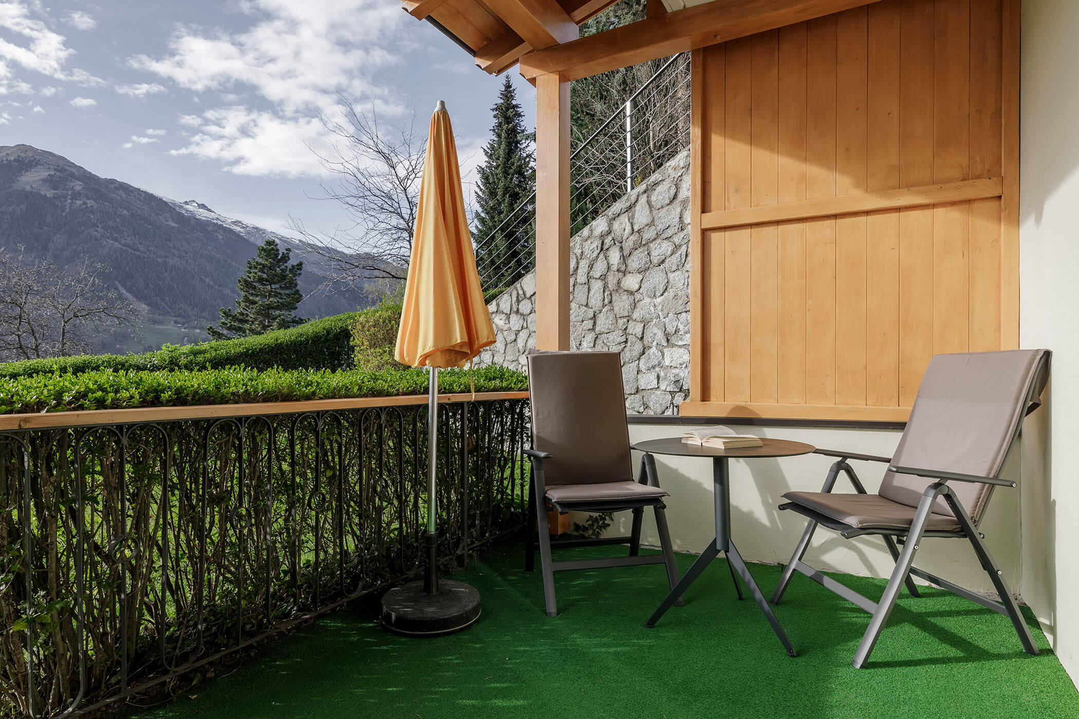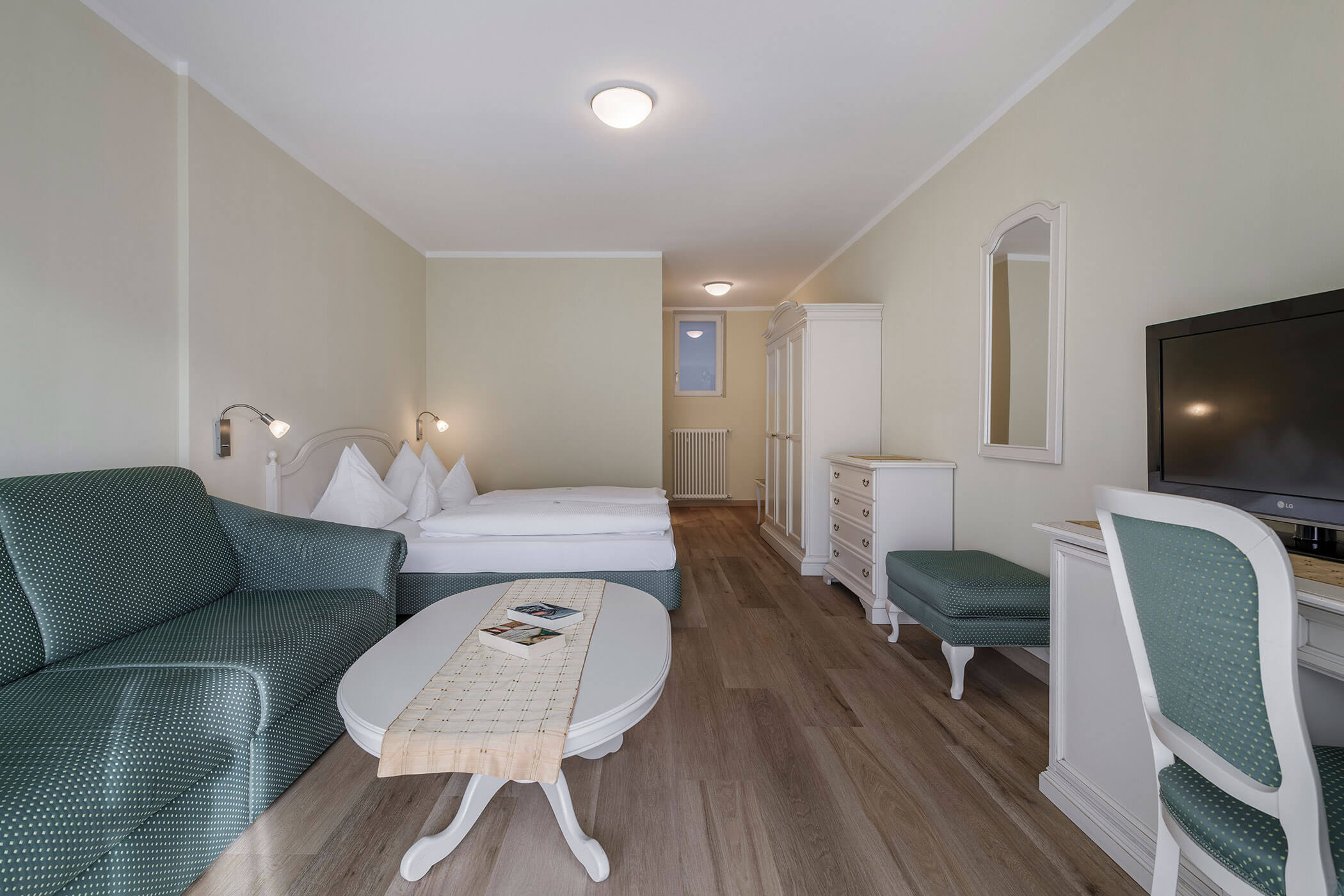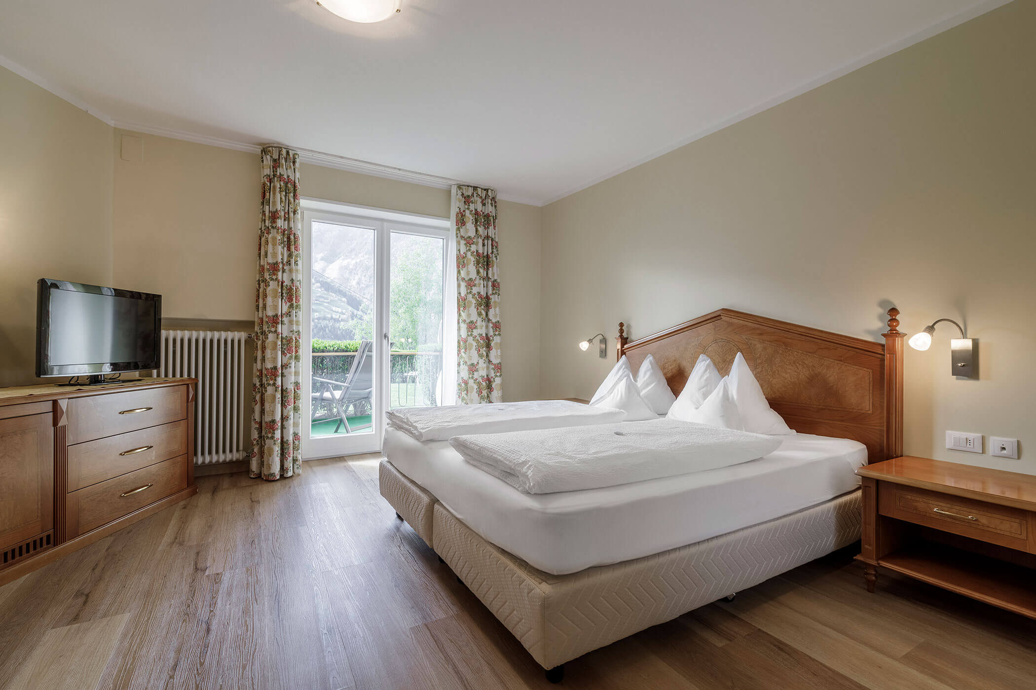 Gemütliches Doppelzimmer mit direktem Zugang zur Liegewiese – ideal für alle, die Sonne und Garten lieben. Die Südwestlage und der Holzboden verleihen dem Raum Wärme und Leichtigkeit.