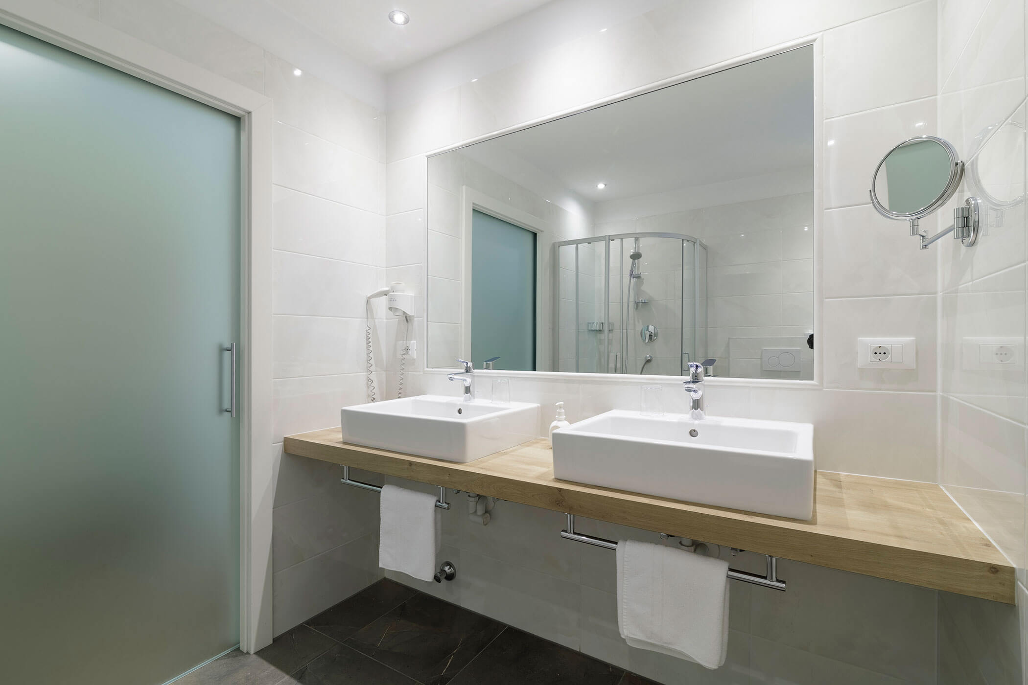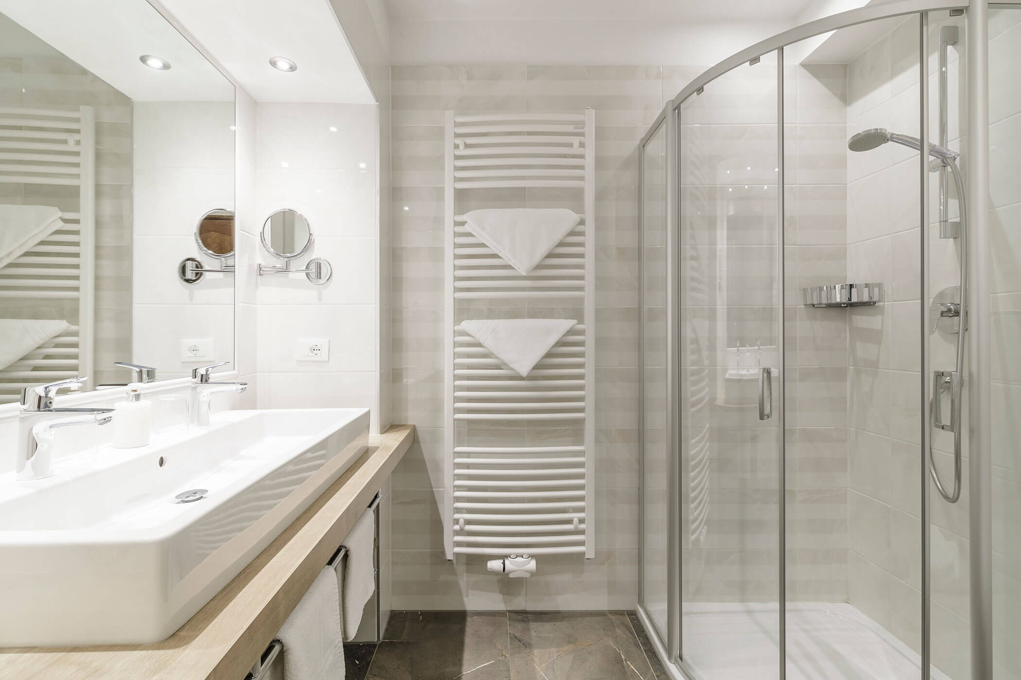 Badezimmer mit Dusche, WC, Haarföhn, Pflegeprodukte